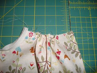BEFORE you stitch down the bias underarm, we’re going to attach the skirt to the bodice. This way, when we finish that underarm, we can complete a bunch of tasks in a single step. For this little jumper, we’ll need to gather the front and backs first, leaving the bias tape UNgathered: