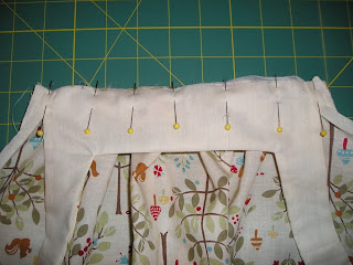 Now we attach the bodice. With right sides together, place the bodice front over the gathered front skirt. At the finished edge of the bodice, tuck the corner inside the bias tape, right up against the seam: